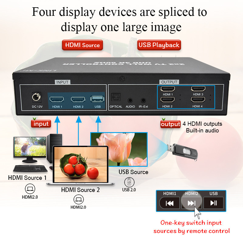 8جهاز تحكم جدار الفيديو الخاص بنا يأتي مع الفيديو من USB وإشارة HDMI يدعم وظيفة تقليم الصورة، وعرض بدون حواف سوداء. كل هذا دون الحاجة إلى أي برنامج.